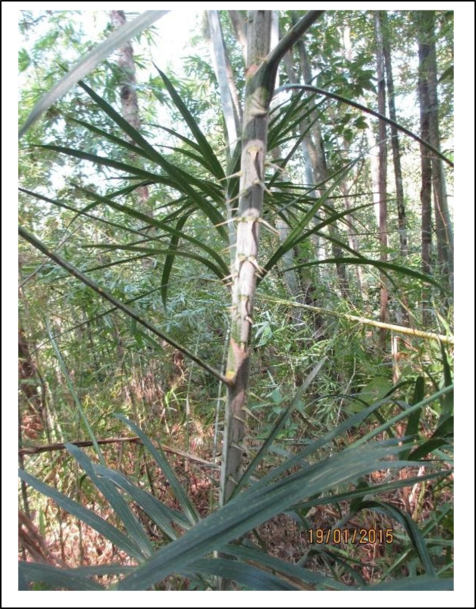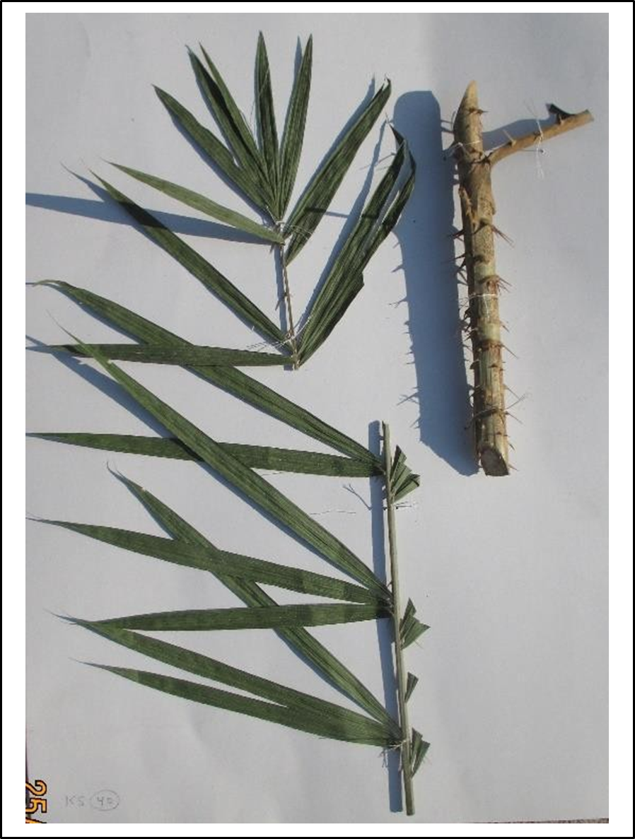 - Description: Stem solitary(?), Round 2 plants stem 10m± (30ft±) long, dia 1.5 cm Leaf-sheath green with spines flat at base, not dense Knee present, Flagella presents Petiole 4.5 cm long, Rachis 85 cm, leaflets on each side 30 numbers, distinctly clustered and spreading in different planes.Inflorescence not found.